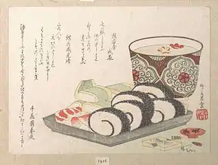 - Сладости — китайские пироги «тогаси», орехи (кедровые орехи, сушёные каштаны, жёлуди), фрукты (ююба, гранат, персик, умэ, хурма, юдзу)[74].