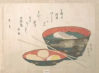 Первые обнаруженные в Японии палочки для еды использовали в Хэйдзё-кё, столице Японии в 710—784 годах[67]. Палочки были найдены исключительно во дворце и придворных территориях, из чего можно сделать вывод, что простой народ продолжал есть руками[67]. В Нагаокакё (столица в 784—794 годах) палочки уже находят и в жилых кварталах[67]. Исторически в Китае супы, рис и другие крупы ели ложками, эта традиция сохранилась и в Корее[68]. В Японии ложки не имели популярности среди простого народа, так как суп принято пить прямо из пиалы[68]. Японский этикет поедания риса отличается и от корейского, и от китайского: в Корее не принято поднимать миску с рисом ко рту, это считается «нищенской» привычкой; в Японии же не принято есть из тарелки, стоящей на столе; китайскую привычку сгребать рис палочками в рот в Японии воспринимают как дурные манеры[68].