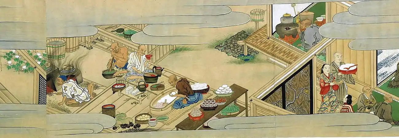 Каждые 20—30 дней в японском обществе наступали священные дни «харэ» (яп. 晴れ)[61]. Главным лакомством праздников были кагами-моти, две большие лепёшки из рисовой муки, положенные друг на друга[58]. В отсутствие водяных мельниц моти, как тофу, так и лапша, требовали затрат большого количества сил на ручной помол муки, и поэтому в деревнях их готовили только к особым датам[58]. При этом традиция требовала, чтобы даже самые бедные крестьяне могли на праздниках вдоволь наесться белого риса, а также чтобы все сильно напились саке[62]. Многие буддийские праздники и праздничные блюда пришли в Японию из Китая вместе с лунно-солнечным китайским календарём, использовавшимся с 553 года до конца XVII века[62].