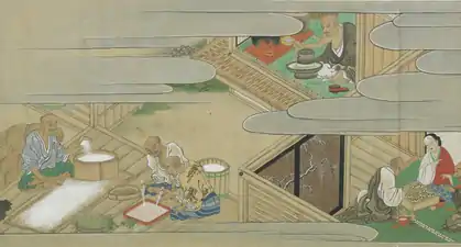 Древнейшие письменные упоминания производства саке датируются IX столетием: жители деревни собирались вместе, жевали рис, что позволяло ферментам слюны превратить крахмал в сахар, а затем выплёвывали в общую ёмкость, где сусло бродило[30]. Со временем слюну заменил кодзи, который также используют для производства соевого соуса и пасты мисо[30].