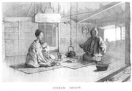 В отличие от Кореи и Китая, где люди в основном ели за общими столами, разделёнными по полу (в Корее — и по возрасту) по конфуцианской традиции, в Японии приём пищи осуществлялся всеми членами семьи вместе, с подносами (яп. 折敷 осики) на коленях, а в богатых домах — за индивидуальными столиками, на каждом из которых стояло одно блюдо. Крупные банкеты включали несколько столиков для каждого гостя[71].