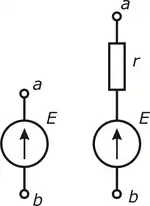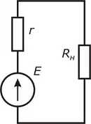 В реальности любой источник напряжения обладает внутренним сопротивлением . Следует отметить, что внутреннее сопротивление — это исключительно конструктивное свойство источника. Эквивалентная схема реального источника напряжения представляет собой последовательное включение идеального источника ЭДС и внутреннего сопротивления .