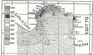 - Зима 1927 — 1938 — начало «Операции 29-й параллели»; в результате координации между колониальными правительствами Триполитании и Киренаики была оккупирована береговая линия залива Сидра, а также произошло объединение двух колоний[7].
