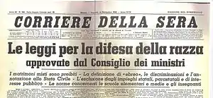 В «Расовом манифесте», опубликованном в июле 1938 г., итальянцы объявлены потомками «арийской расы». Он был нацелен на расы, которые считались низшими (т.е.не арийского происхождения). В частности, евреям было запрещено заниматься многими профессиями, а их собственность могла быть конфискована. Согласно расовым законам, сексуальные отношения и браки между итальянцами, евреями и африканцами были запрещены, евреям было запрещено занимать должности в банковском деле, правительстве и образовании, а их собственность была конфискована[4][5].