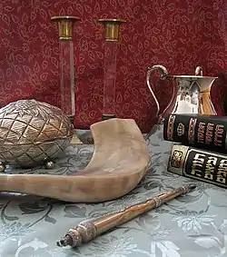 Один из внешних символов иудаизма с XIX века — шестиконечная Звезда Давида[14]. Более древним символом иудаизма является семисвечник (Менора), который, согласно Библии и традиции, стоял в Скинии и Иерусалимском храме. Две расположенные рядом прямоугольные скрижали с закруглённой верхней гранью также являются символом иудаизма, зачастую встречающимся в орнаменте и декорации синагог. Иногда на скрижалях выгравированы Десять заповедей, в полной либо сокращённой форме, либо десять первых букв еврейского алфавита, служащих для символической нумерации заповедей.