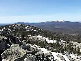 ![]() Вершина горы Ицыл. Вид на северный гребень Ицыла, на гору Круглица и хребет Большой Таганай | |