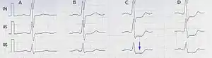 - Электрокардиограмма (ЭКГ) — метод предполагает запись активности сердца: насколько быстро оно бьётся и стабилен ли ритм. ЭКГ основана на регистрации силы и времени прохождения электрических сигналов через сердце. ЭКГ может указать на повреждения сердца, вызванные ишемической болезнью сердца, а также на текущий или перенесённый сердечный приступ. ЭКГ не используют для скрининга болезней сердца у людей с низким риском их развития[20].