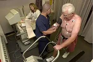 - Стресс-тестирование, суть которого состоит в наблюдении пациента под нагрузкой, например, во время тренировки, когда повышается пульс. Во время и после нагрузок снимают ЭКГ. Стресс-тестирование используется как для первичной диагностики (особенно если есть боль в груди, тахикардия, аритмия, частые головокружения), так и для оценки безопасного уровня нагрузки при ишемической болезни сердца или перенесенном сердечном приступе[21]. Более наглядная модификация этого теста — радионуклидный стресс-тест, когда в кровоток добавляют радиотрейсер — соединение с радиоактивной меткой, чаще всего изотопом фтора, например, фтордезоксиглюкозу. Молекулы радиотрейсера накапливаются в тех областях, где протекает воспаление. Визуализацию работы сердца в состояниях покоя и нагрузки в этом случае делают при помощи позитронно-эмиссионной томографии (ПЭТ), а иногда совмещают анализ с КТ или МРТ[22][23].