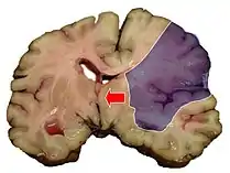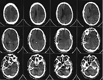 ![]() Компьютерная томограмма головного мозга, демонстрирующая инфаркт в правом полушарии головного мозга (зона инфаркта обведена красным.) | |