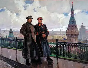 «Я стал думать на эту тему [то есть о Сталине и Ворошилове], и пришла в голову мысль, что нужно написать их как олицетворение: один — Красной Армии; другой — всех народов. И в то же время в позах — выражение непоколебимости, уверенности. Эти позы должны представлять, что народы и Красная Армия — это одно и то же, один монолит… Мне нравилась серебристая гамма. И вдруг я подумал: чего же проще — написать их перед тем дворцом в Кремле, в котором происходят заседания правительства. Вот этот тротуар я хорошо помню. Они могли выйти, встать здесь, ждать автомобиля или смотреть на Москву. Со стороны идеологической было решено. Надо было сделать целый ряд эскизов, потому что серебристая гамма для меня была трудной, — я привык к мажорным краскам, а серый тон страшно трудный. Такое большое количество нюансов в нём, что я долго бился над этой картиной»