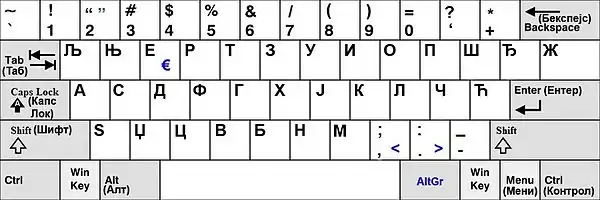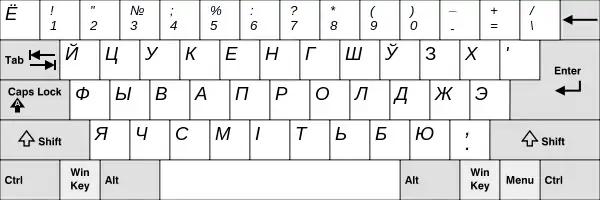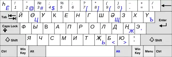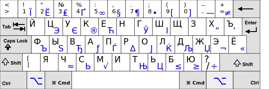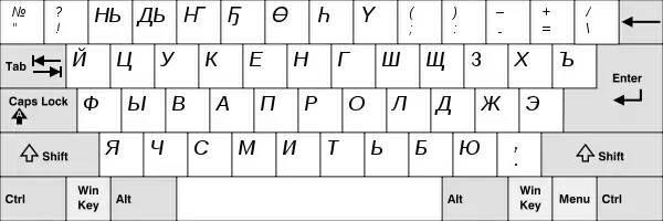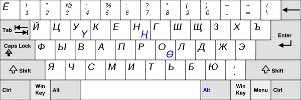 Эта версия раскладки доступна в Windows Vista и выше. Заглавные версии букв «Ь» и «Ы» тоже можно набирать, но только при включённом режиме Caps Lock. Заглавную версию буквы «Ѝ» можно набирать с помощью дополнительной клавиши, а при её отсутствии — аналогично букве «Ы» (в режиме Caps Lock с зажатой «Shift»).