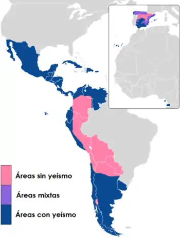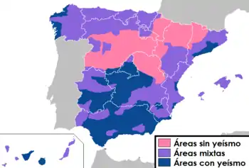 Различие между /ʝ/ и /ʎ/ сохранилось на Филиппинах, в нагорьях Эквадора, в перуанских Андах, Парагвае, на значительной части территории Боливии и в северо-восточных районах Аргентины на границе с Парагваем[8]. Чаще всего различие наблюдается на территориях, на которых распространён билингвизм — испанский и местный язык (например, аймара или гуарани)[9]. Северная часть Испании, а также некоторые области на юге сохраняли различие между фонемами, однако йеизм получил широкое распространение и в настоящее время наблюдатеся практически на всей территории Испании за исключением районов, где имеется языковой контакт с каталанским и баскским языками[10].