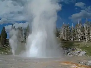 Йеллоустон — это громадное гейзерное поле. На территории парка находятся около 3 тысяч гейзеров, что составляет 2/3 всех гейзеров в мире. Среди них — самый большой в мире гейзер «Пароход» (англ. Steamboat Geyser), а также один из самых известных — гейзер «Старый служака» (англ. Old Faithful Geyser), выбрасывающий струи горячей воды на высоту более сорока метров с интервалом от 45 до 125 минут, однако преимущественно извержения происходят с интервалом в 90 минут[9] — именно благодаря своей предсказуемости гейзер и стал столь популярным.