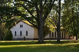 Вспомогательные мызные здания находятся к северо-востоку от господского дома. Ближе всего к нему стоит амбар с остроконечными арками, в паре сотен метров далее друг против друга расположены конюшня, каретник и водочная фабрика; за ними находится целый комплекс хозяйственных построек: дом управляющего, коровники и пр.