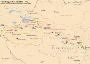 Чтобы предотвратить захват Якуб-беком Таранчинского султаната и не допустить роста английского влияния в Средней Азии, русские войска в 1871 году оккупировали Илийский край и ликвидировали здешнее уйгурское государство. Войска Якуб-бека совершили два похода против дунганского Урумчинского султаната, и в 1870—1872 годах присоединили его территорию к Йеттишару. На сторону Якуб-бека перешёл Мухаммед Аюб Биянху — один из лидеров восстания дунган в Шэньси, в 1873 году вытесненный китайскими войсками на северо-запад и обосновавшийся в Урумчи, а также другие дунганские командиры и беженцы из провинций Шэньси и Ганьсу.