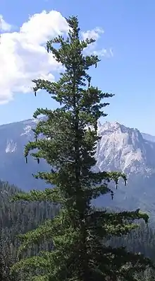 Ещё выше деревья становятся более низкими и редкими, группами, разделёнными гранитными скалами. Среди них растут сосна скрученная широкохвойная, сосна белокорая и тсуга горная — они образуют верхний уровень древесной растительности. Климат в этих местах суровый, вегетационный период короткий, но некоторые виды как пищуха, желтобрюхий сурок (лат. Marmota flaviventris), белохвостый заяц[9] (лат. Lepus townsendii), североамериканская ореховка (лат. Nucifraga columbiana) и сибирский вьюрок (лат. Leucosticte arctoa) сумели адаптироваться к этим условиям. Кроме того, на безлесных альпийских лугах любит пастись толсторог, однако этот вид в настоящее время замечен лишь в районе перевала Тайога, где реинтродуцирована небольшая популяция этих животных.