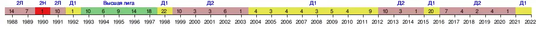 Список выступлений команды в первенстве СССР (1988—1991) и в чемпионате/первенстве России, а также в Кубке СССР/России.