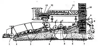 Опорные катки 1 ездят по бороздам и держат качающийся фигурный лемех 2 на заданной глубине. Лемех одновременно подкапывает две грядки, разрушает пласт и передаёт массу на двухрешётный грохот 3, на котором происходит крошение пласта и просеивание почвы. С грохота масса поступает на транспортёр 5 с пневматическими баллонами 4 и далее через разреженный прутковый транспортёр 7 на сепарирующий элеватор 6. Оттуда оставшаяся почва и клубни попадают в барабанный транспортёр 10, а ботва с травою берутся прутками транспортёра ботвоудаляющего устройства. При прохождении ботвы между прижимным транспортёром 9 и отбойным валиком 8 имеющиеся на ботве клубни отрываются и попадают в барабан. Барабанный транспортёр подаёт массу на наклонный транспортёр-переборщик 11, который частично разделяет клубни и примеси. Рабочие отбирают отделяют примеси и клубни. Примеси с переборщика поступают на поперечный ленточный транспортёр 13 и выносятся им из комбайна на поле. Чистые клубни промежуточным транспортёром 12 подаются в транспортёр-копильник. Оттуда картофель выгружается в транспорт.