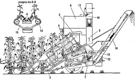 При движении машины по полю стебли кукурузы, попадав в русла между делителями, захватываются и подводятся к режущему аппарату. Срезанные стебли перемещаются этими же цепями в вертикальном положении к отрывочным вальцам, нижние концы стеблей при этом скользят по наклонным лоткам. Около заднего конца лотка комли стеблей переходят в устье питающих вальцов, которые захватывают их и протягивают вниз. Одновременно с этим стебли продолжают двигаться назад благодаря наличию на отрывочных вальцах винтовых рифов. Во время протягивания стеблей между вальцами початки отрываются от стеблей и падают на цепочно-планчатый транспортёр, затем в шнек, которым они перемещаются на элеватор початков. Своими скребками элеватор захватывает их и транспортирует в бункер. Стебель измельчается в барабане. Измельчённая масса выбрасывается барабаном на элеватор и перемещается им в прицепной копнитель. Периодически после каждого заполнения копнителя масса выгружается в транспорт. Вместо копнителя может использоваться тракторная тележка, куда будет выгружаться измельчённая масса.