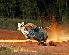 Охота на кабана сопряжена со значительной опасностью, так как они нередко бросаются на охотников, причём самцы-«секачи» наносят рваные раны своими мощными клыками; самки же, у которых клыки менее развиты, чем у самцов, сбивают неосторожных охотников с ног и бьют их передними копытами. Поэтому при загонной охоте на кабана иногда устраивают для охотников невысокие платформы, с которых кабаны, вследствие неподвижности своей шеи, не могут сбросить охотника. Когда кабан бросается, лучше всего отскочить перед самим животным в сторону, так как кабан, пронёсшись мимо, редко возвращается обратно для нового нападения. Опаснее всего старые кабаны, держащиеся в одиночку, а потому и называемые одинцами. У старых секачей перед гоном образуется на спине и по бокам что-то вроде брони из подкожной хрящевидной ткани[26]. Во время гона эта броня (калкан) предохраняет бока животного от ударов клыков другого самца во время драки за самку. Кроме загона, на кабанов охотятся с притравленными на них собаками (гончими и другими породами с примесью гончей крови). Ночью кабана подкарауливают на засеянных полях, куда они выходят кормиться. В азиатской части бывшего СССР, где кабаны водятся не только в лесах, но и в камышах, на них охотятся верхом, преследуя выпугнутых из камышей животных и стреляя их на всём скаку. Гонят дикого кабана окриками «Ач-ач!» Также распространена охота с вышек (лабазов), где животных поджидают, когда они придут на подкормочную площадку.
