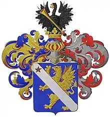 На щите дворянский коронованный шлем. Нашлемник: взлетающий чёрный орёл с красными глазами и языком, держащий в левой лапе диагонально вверх вправо золотую трубу. Намёт справа голубой с золотом, слева красный с серебром[2].