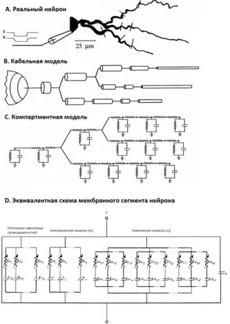 B. Кабельная модель: нейрон как множество цилиндрических кабелей. Напряжение в любой точке дендритного дерева вычисляется с помощью кабельного уравнения и необходимых граничных условий (см. текст).