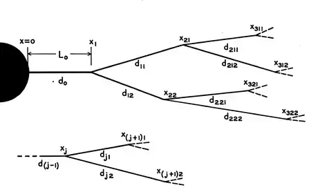 Для простоты предположим, что две самые крайние ветви заканчиваются запечатанными концами (граничные условия), то есть осевой ток не проходит в кабель. Входные сопротивления двух самых крайних дочерних ветвей в точке разветвления, глядя в сторону их концов, задаются через уравнения входного сопротивления для бесконечного кабеля как