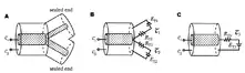 - Электротонический ток испытывает влияние двух различных сопротивлений: внутреннего (или осевого) и мембранного сопротивления. Для простоты описания пассивного распространения потенциала, при установившемся входе к кабелю или дендриту с однородным потенциалом покоя (Er), Er и ёмкость Cm могут быть проигнорированы. Следовательно, ток только делится на каждой точке прохождения через две линии сопротивления: осевого и мембранного.