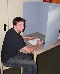 Кабина для голосования — при тайном голосовании, специально оборудованное для сохранения тайны голоса индивидуальное место в помещении для голосования. Если выборы проводятся при помощи бюллетеней, кабина должна быть также приспособлена для их заполнения, то есть иметь столик или полку и письменные принадлежности[1] за исключением карандашей[2]. Если же на выборах задействованы устройства сенсорного голосования, главной задачей кабины является сокрытие от глаз посторонних экрана, на котором избиратель производит свой выбор. Непосредственно в кабине также могут быть вывешены инструкции по правильному заполнению бюллетеня.