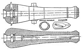 В чине капитана Кавалли был в 1846—1847 гг. для выполнения своего проекта командирован в Швецию на завод Варендорфа в Окере. Из имевшихся чугунных стволов для 22-см. и 27-см. гаубиц были приготовлены 6,5-дм. и 8,3-дм. гаубицы, снабженные каждая 2 глубокими нарезами m (см. рис.), с длиною хода 22 калибра для двух таких же продольн. наклон. к оси выступов aa, составлявших одно целое с телом чугунного снаряда яйцевидной формы. Затвор, в виде призматического клина GH, вкладывался руками в поперечное отверстие CD в казне и прикреплялся к орудию особою цепью; обтюратором служило медное кольцо F, в гнезде среза канала; к нему прижималась передняя грань клина; позади заряда еще вкладывалась чугунная чашка, служившая дном канала и прижимавшаяся газами к клину, устраняя сильное загрязнение клина пороховым нагаром, в целях более лёгкого извлечения его после выстрела. При стрельбе из 30-фн. (6,5-дм.) нарезной гаубицы дальность, при угле возвышения 13°, получилась 3,5 мтр., то есть на 25% больше, чём у гладкой 22-см. гаубиц, при меткости в 18 раз большей, чем у последней. Снаряд весил 30 килограмм при относительном заряде ⅛. Несколькими такими орудиями пьемонтская артиллерия пользовалась при осаде Гаэты в 1860—1861 гг[3][2].