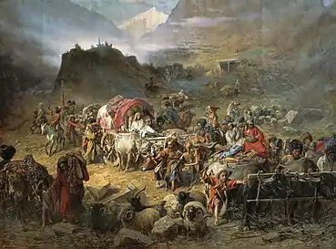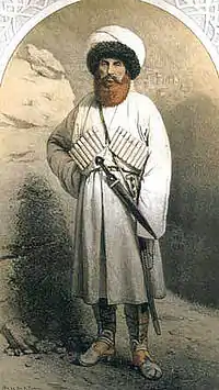 С середины 1830-х годов конфликт обострился в связи с возникновением в Дагестане (а в 1840 году и в Чечне) религиозно-политического движения под флагом газавата, которое получило моральную и военную поддержку Османской империи и Великобритании (которая особенно усилилась во время Крымской войны)[38]. Сопротивление горцев Чечни и Дагестана было сломлено в 1859 году, когда взяли в плен имама Шамиля. Война же с адыгскими племенами Западного Кавказа продолжалась до 1864 года и закончилась массовым исходом большей части адыгов и абазин в Османскую империю, оставшееся небольшое их количество было переселено на равнинные земли Прикубанья.