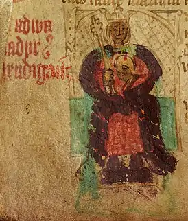 ![]() Изображение Кадваладра из рукописи «Истории королей Британии» XV века | |