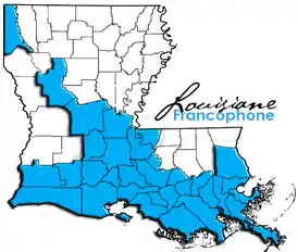 Распространение французского языка в Луизиане. В приходах, отмеченных жёлтым 4-10 % населения говорит дома по-французски или на каджунском диалекте. В приходах. отмеченных оранжевым — 10-15 %, красным — 15-20 %, коричневым — 20-30 %