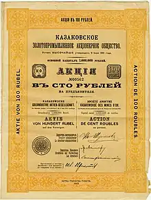 Акция в сто рублей на предъявителя Казаковского золотопромышленного акционерного общества. Российская империя, Чита, 1912 г.