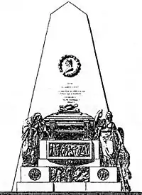С этим надгробием произошла история, объяснить которую исследователи пока не могут. Оно было изготовлено известным швейцарским скульптором Александром Триппелем в его римской мастерской. По плану Триппеля, основу надгробия составляла большая пирамида в тёмной мраморной облицовке. У основания пирамиды находился постамент белого мрамора с тремя рельефными изображениями. Чуть выше располагался мраморный блок полукруглой формы с фризовой аллегорической композицией в «античном стиле». На мраморном блоке был установлен саркофаг цветного мрамора, по обеим сторонам которого располагались две аллегорические фигуры, символизирующие Печаль и Славу. И, наконец, венчало композицию замечательное портретное профильное изображение Чернышёва белого мрамора, расположенное в медальоне чёрного мрамора[17]. А. Чекмарёв считает возможным, что пирамида, саркофаг и постамент под него были изготовлены в Петербурге. При транспортировке частей памятника в усадьбу пирамида треснула и была повреждена в нескольких местах[18].