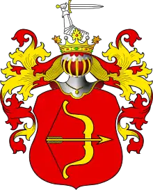 В красном поле золотой лук, натянутый стрелой влево.