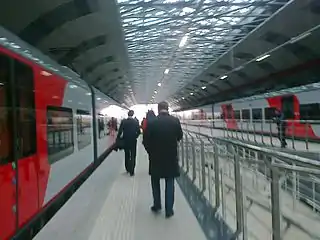 Аэропорт связан с городом (от главного ж/д вокзала «Казань-1») железнодорожной радиальной 26-километровой Линией в аэропорт городского поезда (Казанской электрички), которая также обслуживает промежуточные южные городские посёлки и имеет невысокую стоимость проезда, приближённую к таковой на городском транспорте. Эта линия ранее, с запуска 22 мая 2013 года, была безостановочной линией Аэроэкспресса, сооружённой к Универсиаде 2013 года[28]. В день открытия Универсиады Аэроэкспрессом воспользовался по пути из аэропорта в город президент РФ Владимир Путин, положительно отозвавшись о его скорости и комфорте. До 2014 года на линии использовался немецкий состав Siemens Desiro «Ласточка», который затем заменён на модернизированный электропоезд ЭД9М из-за малого числа пассажиров, более дорогой (на 40 %) стоимости обслуживания поезда в сравнении с электричкой и вызванной этим нерентабельности интермодальных перевозок на «Ласточках» несмотря на высокую стоимость проезда (200 руб.)[29].