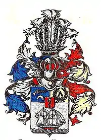 Щит разделен на да три части, из коих в первой в голубом поле изображен золотый пистолет и под оным серебряная луна, рогами вниз обращенная. Во второй в золотом поле между лавровою и масличною ветвиями чернаго цвета стропило. В нижней пространной части В серебряном поле военное судно с распущенными парусами. Посредине в малом щитке изображен употребляемый в роде Козарскаго герб, то есть: в красном поле извивающийся уж, увенчанный дворянскою короною, и держащий во рту яблоко. Щит увенчан дворянскими шлемом и короною с пятью на оной строусовыми перьями. Намет на щите голубый и золотый, подложенный серебром и красным.