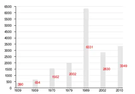 | 1897[3] | 1926[4] | 1939[5] | 1959[6] | 1970[7] | 1979[8] | 1989[9] | 2002[10] | 2010[1][2] |