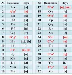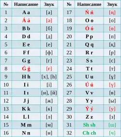 • Кириллическая графика[~ 1] — официально используется с 1940 года, и будет использоваться в Республике Казахстан параллельно с новым латинским алфавитом до 2025 года. Кириллический алфавит используется казахской ирредентой[~ 2] в Киргизии, России, Туркмении и Узбекистане, а также в Монголии[~ 3] и диаспорой в других странах бывшего СССР.