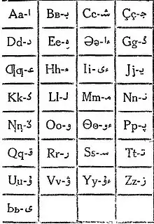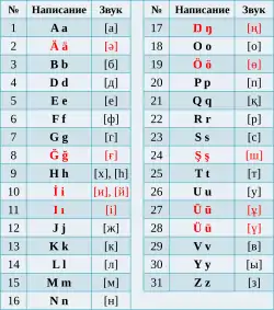 • Латинская графика — алфавит на латинской графике официально утверждён[~ 4] в 2017 году в Республике Казахстан. Переход на этот алфавит планируется осуществить в течение 2017—2025 годов[1]. Ранее, в 1929—1940 годах на территории СССР и Монголии применялся Яналиф[~ 5], в КНР в 1964—1984 годах применялась латиница на базе пиньиня. Также некоторыми сообществами применялись неофициальные латинские алфавиты[~ 6].