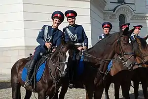 - Лампас — цветная нашивка на боковом шве брючины (шаровар), обозначает принадлежность к войсковому казачьему сословию, а цвет указывает на принадлежность к конкретному войску, обычно совпадая по цвету с околышем фуражки и верхом папахи. Казачий лампас, в отличие от других (регулярных) частей русской, а также иностранных армий, прежде всего является символом вольности, сословной принадлежности; лампасы — неотъемлемая часть формы казака, даже в мирное время.