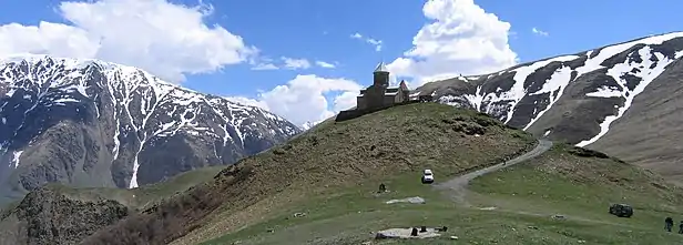 Главным украшением Хеви (прилегающая к Казбеку историческая область Грузии) и его символом является Троицкая церковь на горе над селом Гергети, которое является частью посёлка Казбеги, сейчас называемого Степанцминда, где одно время хранился Крест святой Нино, просветительницы Грузии (IV век). Храм живописно расположен на фоне Казбека, прямо над посёлком Степанцминда (бывший Казбеги). Хоть этот храм и посвящён Святой Троице, главным его праздником считается день Успения Богородицы — 28 августа.
