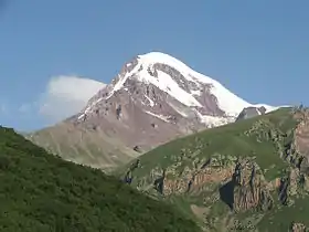 ![]() Вершина Казбека летом. Вид со стороны посёлка Степанцминда, Грузия (2007 г.). | |