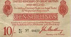 В соответствии с законодательством Казначейство не имеет права выпуска банкнот, это право предоставлено Банку Англии, трём шотландским и четырём североирландским банкам. Однако из этого правила было сделано одно исключение. С началом Первой мировой войны законом (Currency and Bank Notes Act 1914) Казначейству было предоставлено право выпуска не разменивавшихся на золото банкнот в 10 шиллингов и 1 фунт, имевших статус законного платёжного средства.