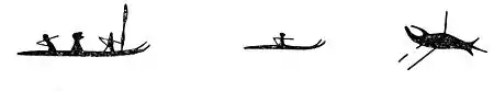 | Слева — алеутский амулет в виде самки калана с детёнышем. Вверху — сцена морской охоты на калана алеутскими охотниками: изображение сделано на древке охотничьего копья. Изображениям каланов алеуты приписывали магические свойства. Оба экспоната хранятся в Музее антропологии и этнографии имени Петра Великого Российской академии наук[57]. |