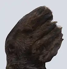 Передняя лапа калана (слева) и задняя лапа (справа). Пальцы на обеих конечностях у каланов сросшиеся, причём на задней конечности срастание происходит вплоть до последней фаланги: таким образом, задняя конечность превращается в подобие ласты. Длины пальцев задней конечности каланов изменяются в обратном порядке по сравнению с большинством млекопитающих, постепенно уменьшаясь от пятого пальца к первому. |