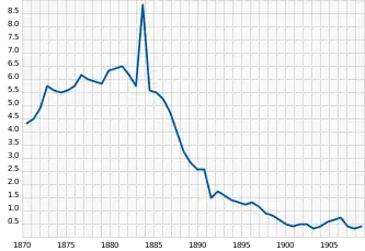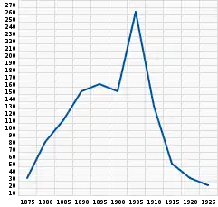 | Добыча каланов на Командорских островах в штуках в период с 1870 по 1924 годы (по материалам архива Командорских промыслов[7]). | Поступление шкурок каланов на аукционы Лондона в период с 1871 по 1910 годы в тысячах штук (по биржевым материалам[53]). |