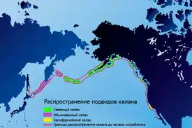 На основании многочисленных свидетельств путешественников XVIII—XIX веков[6][28][35][36] исследователи предполагают, что первоначально каланы обитали непрерывной дугообразной полосой по северному побережью Тихого океана: начиная от середины полуострова Нижняя Калифорния в Мексике (около 27° с. ш.), далее на север вдоль западного побережья США и Канады, затем параллельно 60° с. ш. вдоль южного берега Аляски и вдоль цепи Алеутских и Командорских островов, затем на юг вдоль восточного побережья Камчатки, вдоль гряды Курильских островов вплоть до северной части японского острова Хонсю (около 40° с. ш.)[7][37].