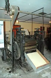 Машина для непрерывного формования листа полимера или бумаги методом пропуска его через зазор между вращающимися валами. В результате каландрирования получается полотно необходимой толщины и ширины[4].